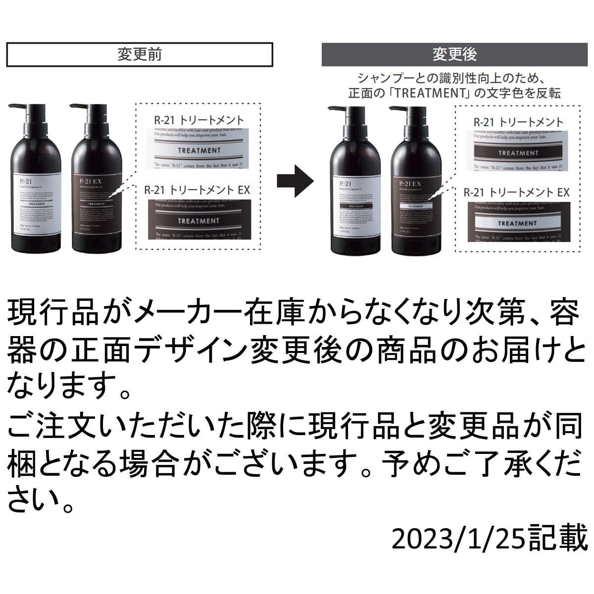 現行品がメーカー在庫からなくなり次第、容器の正面デザイン変更後の商品のお届けとなります。