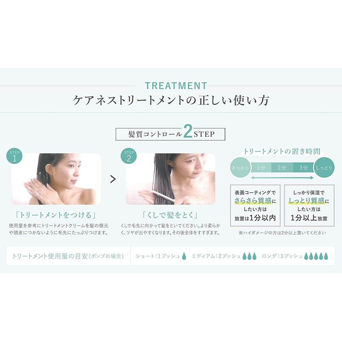 【トリートメント使用量の目安(ポンプの場合)】ショート:1プッシュ/ミディアム:3プッシュ/ロング:5プッシュ