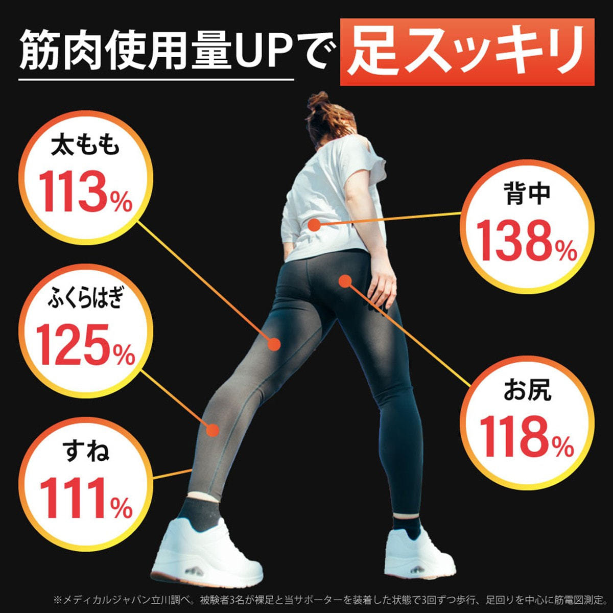 ※メディカルジャパン立川調べ。被験者3名が裸足と当サポーターを装着した状態で3回ずつ歩行、足回りを中心に筋電図測定した平均値より。