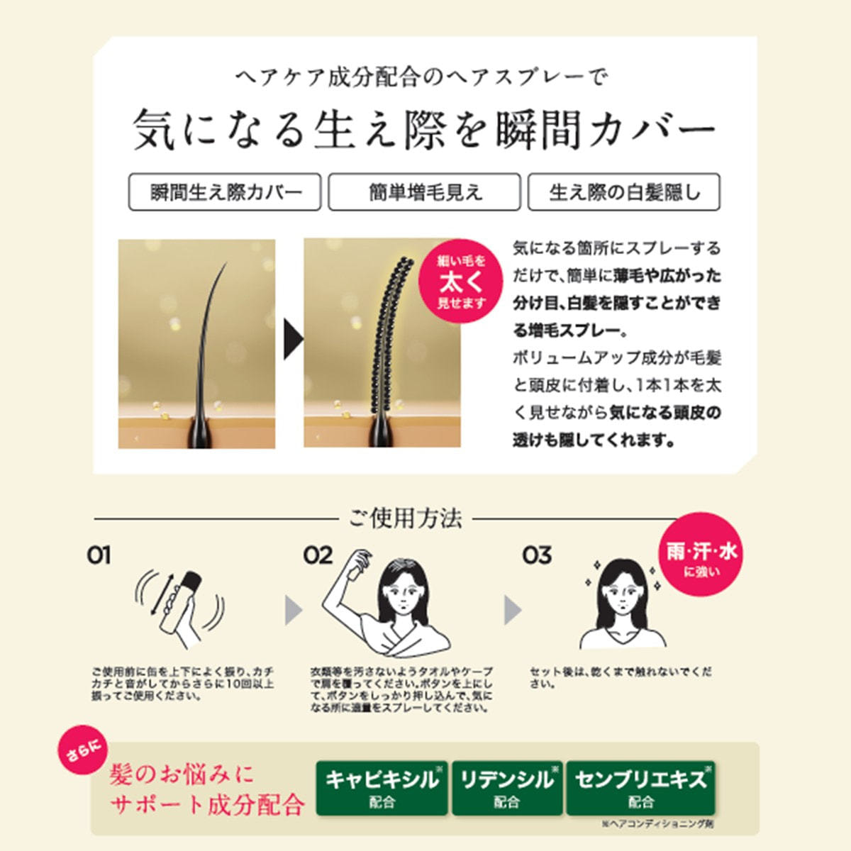 ヘアケア成分配合ヘアスプレーで気になる生え際を瞬間カバー。