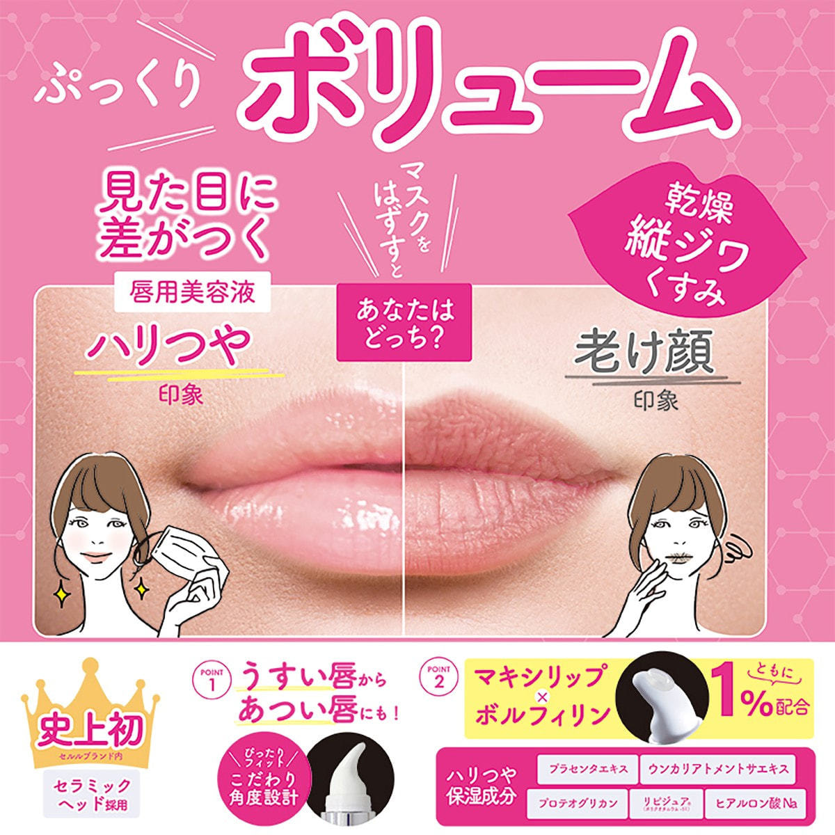 ぷっくりとした若々しい唇を造るためにマキシリップ、ボルフィリンの2大原料をたっぷり配合したリップセラム。