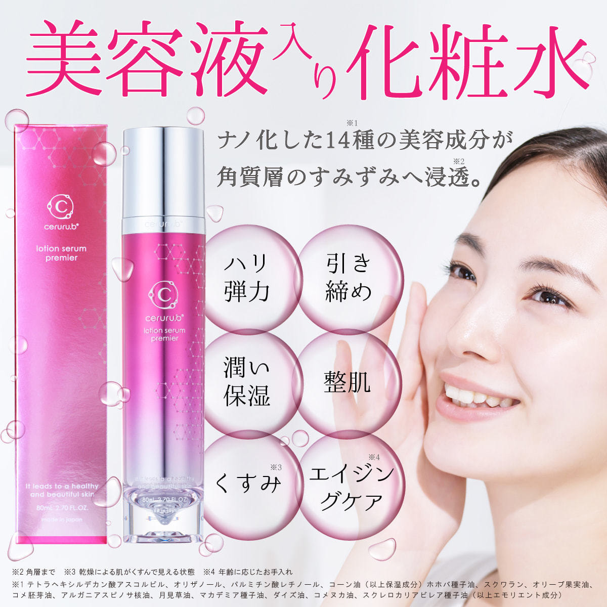 油溶性ビタミンC誘導体や安定型ビタミンA誘導体、栄養豊富な植物エキスを含む14種の美容成分を従来のナノ技術に対し、約1/20サイズにナノカプセル化。