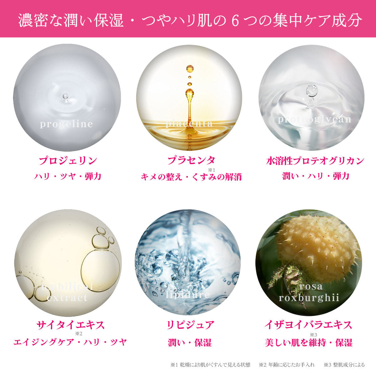 総合的なエイジングケアとして『プラセンタエキス』『プロテオグリカン』『サイタイエキス』『リピジュア』『プロジェリン』配合。